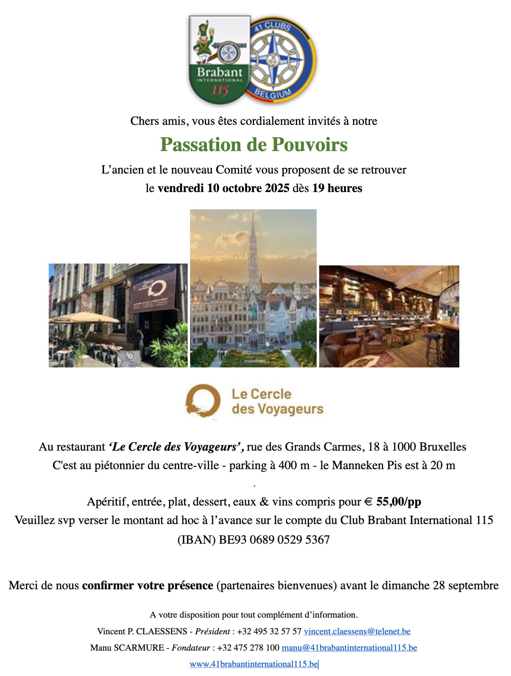 Si vous souhaitez participer à une de nos réunions : Contactez notre Président Vincent Claessens au GSM : 0495 325.757, ou par mail : vincent.claessens@telenet.be